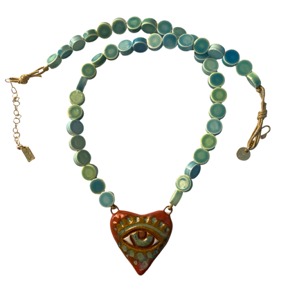 Add some charm and protection to your outfit with our Clay Evil Eye Necklace. Featuring a hand-carved evil eye in a heart-shaped pendant, accented with green turquoise ceramic beads. This truly unique piece will make a playful addition to your jewelry collection. We also offer a matching bracelet, shown below.