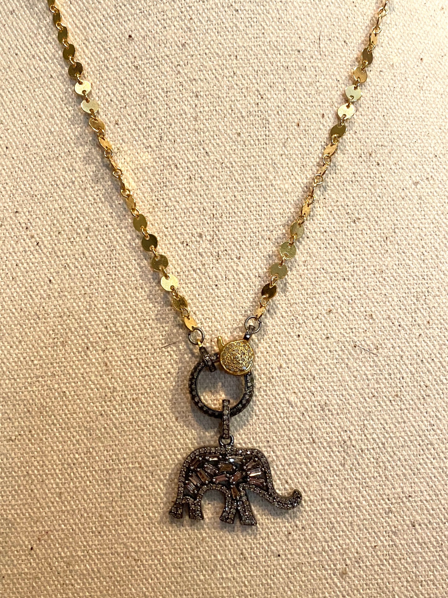 This diamond elephant necklace combines everyday elegance with a touch of whimsy. The gorgeous diamonds add a touch of sparkle, while the elephants symbolize never forgetting. The diamond lobster clasp and gold filled sequin chain make this necklace both stylish and secure. Perfect for those who appreciate playful yet refined accessories!