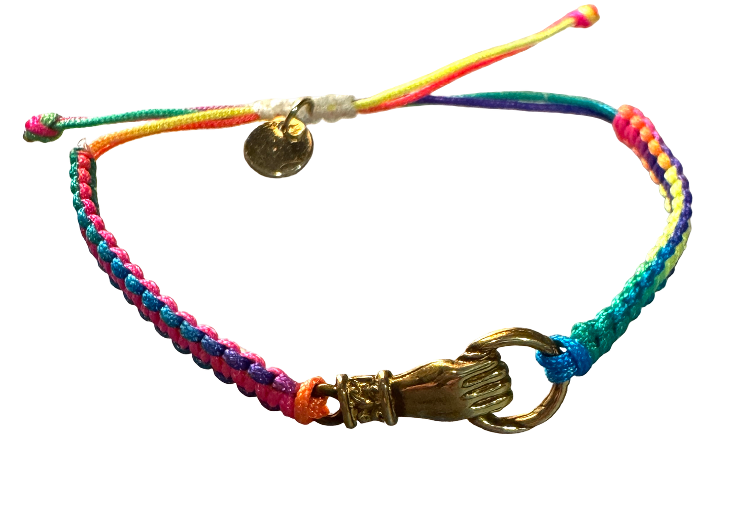 Celebrate friendship with this playful macrame bracelet featuring a festive rainbow cord. Its adjustable design ensures a comfortable fit for most wrists, while the gold-tone hand connector adds a charming touch. Perfect for brightening any outfit and sharing joyful vibes.