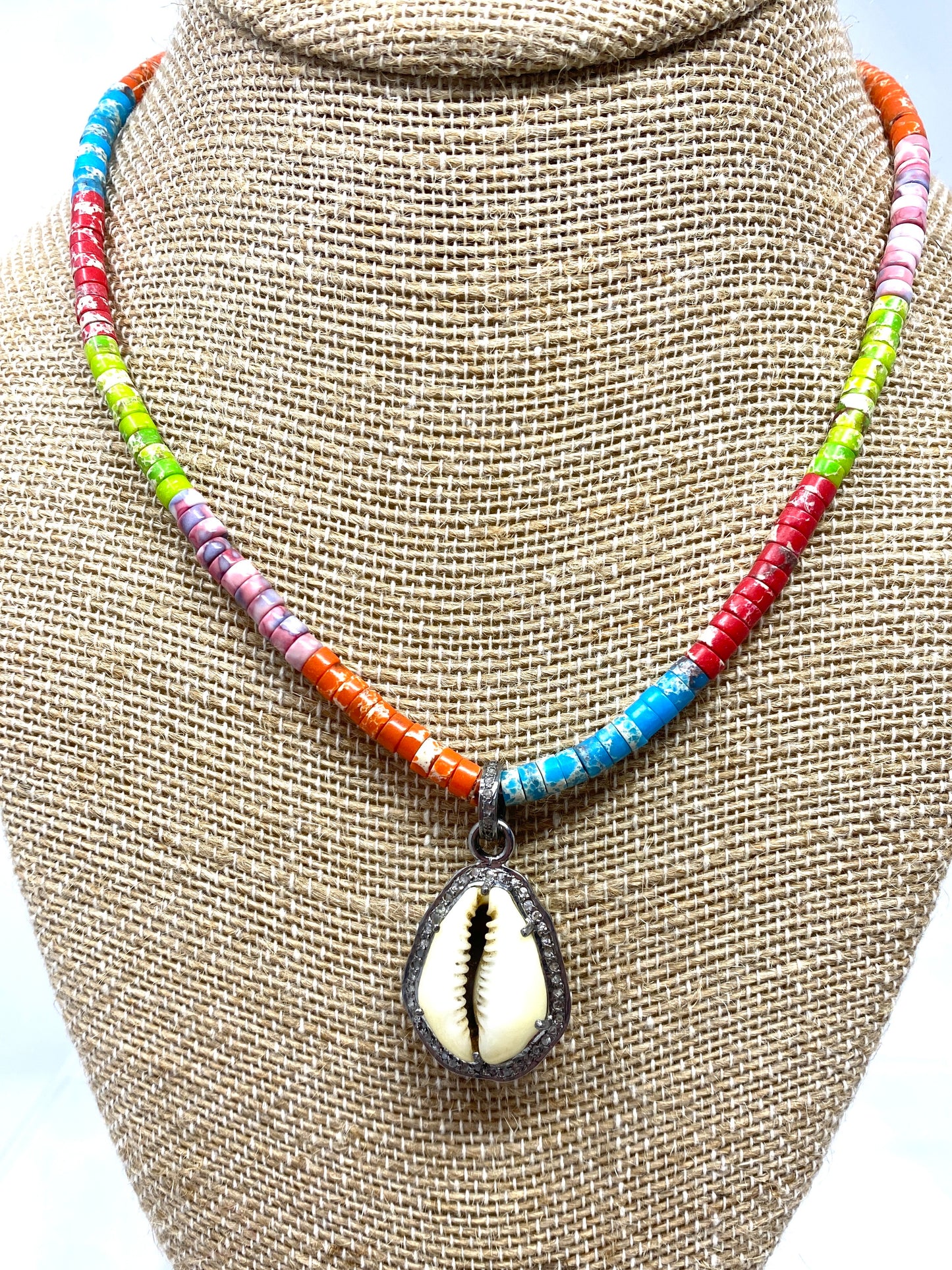 Enhance your vacation look with our Multicolor Turquoise Necklace. Adorned with a sparkling diamond pendant and a unique cowrie shell, this necklace adds a touch of festivity to any outfit. Perfect for beach vibes and summer adventures.