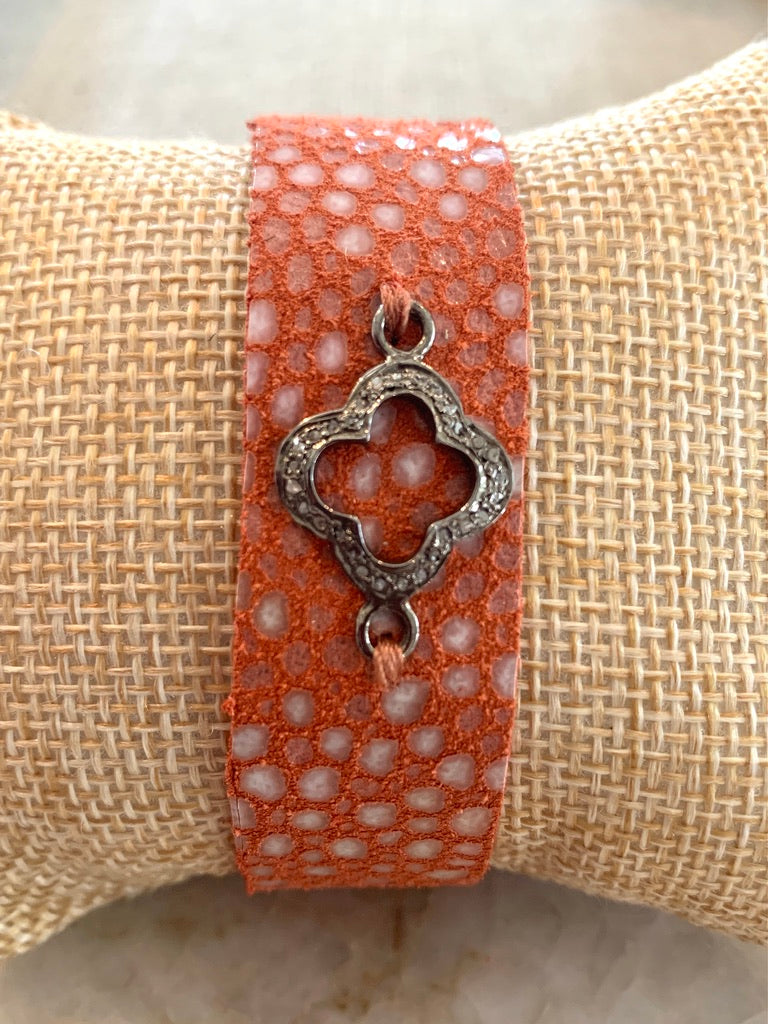 Coral Leather Cuff Bracelet with Pave Diamond Clover Connector