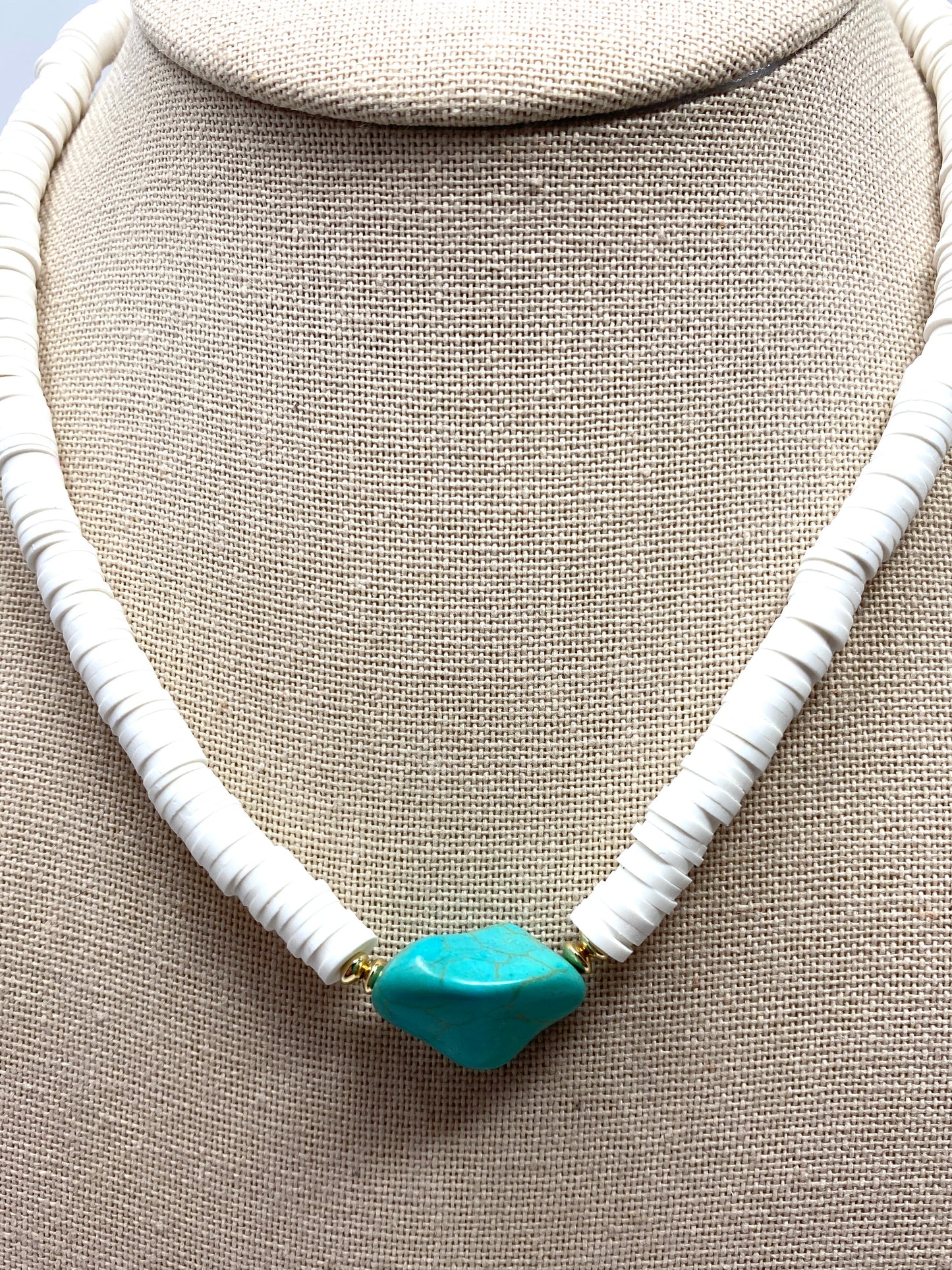 Add a pop of color with our Rubber Disc and Turquoise Necklace. Featuring a crisp white rubber disc and a chunky turquoise center stone, this necklace is sure to make a statement. Small gold filled spacer beads add a touch of elegance on either side of the turquoise.