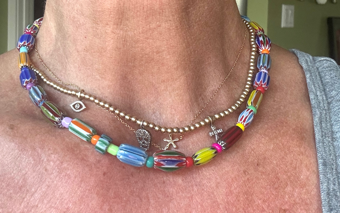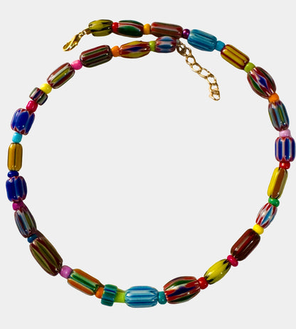 Add a splash of vibrant color to your summer look with this Trading Bead Summer Necklace. Featuring authentic trading beads used in Africa, its rich hues bring a playful charm that pairs perfectly with a classic white T-shirt. Lightweight and eye-catching, it’s the ideal accessory to brighten your sunny days.