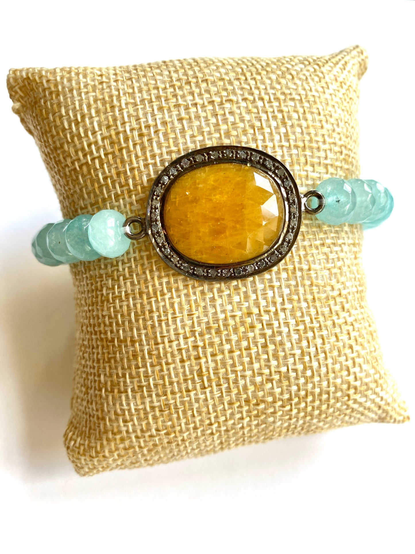 One inch yellow sapphire and diamond center stone on turquoise colored chalcedony rondelle beads. Picture sitting on the beach with the sun on your face...that's what this bracelet represents. One of a kind.